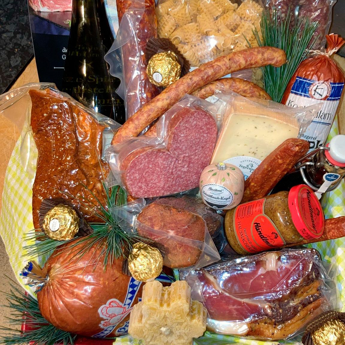 Je nach Saison und nach Ihren Wünschen und Vorlieben gefüllt mit Feinem von Wurst, Schinken, Käse, Wein, Gebäck und Süßigkeiten - Ihre Lieben werden sofort drauf los schlemmen!
