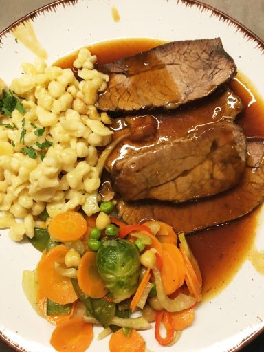 Burgunderbraten an Rotweinsoße € 15,-