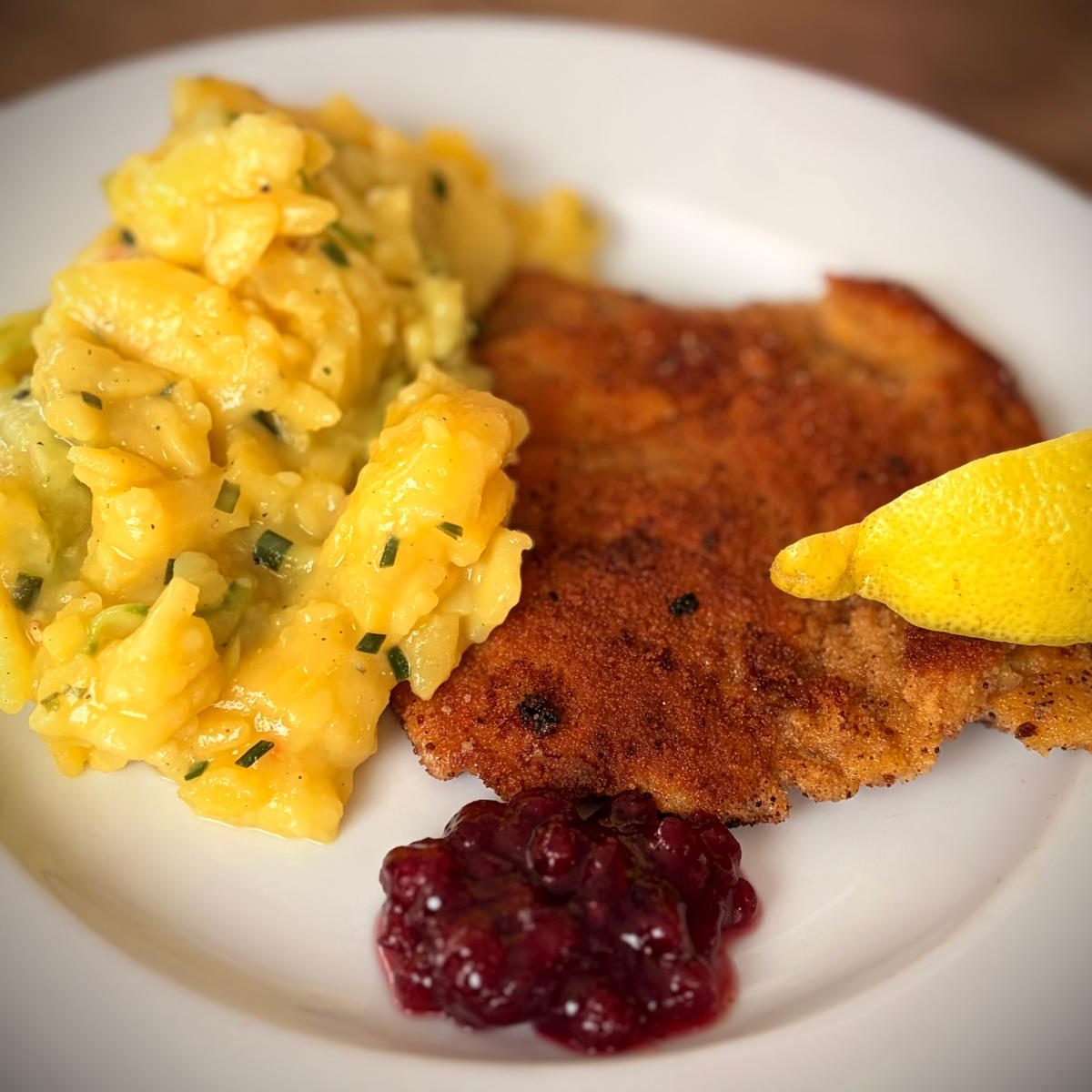 Putenschnitzel mit Kartoffelgurkensalat € 9,-